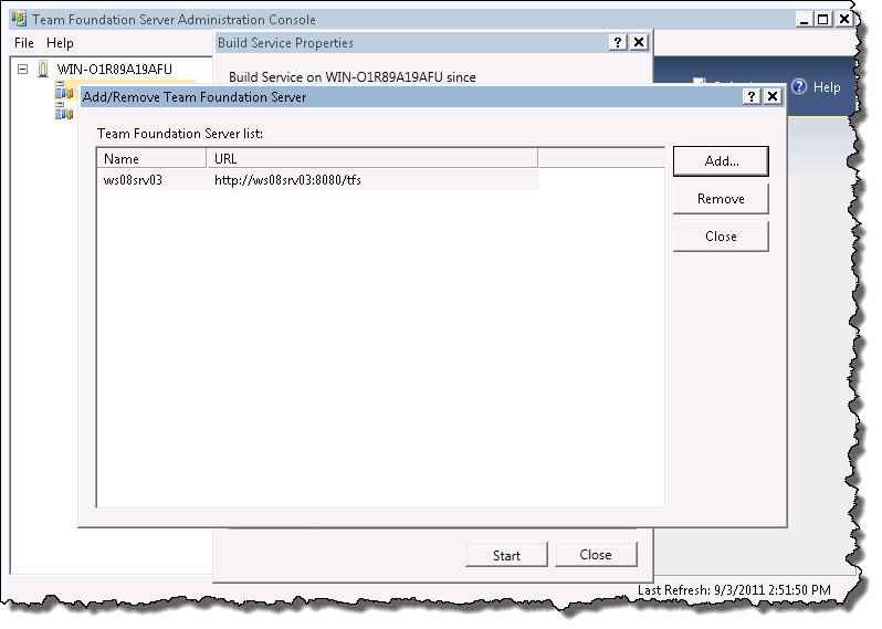 If you made it here then the service should be running and configured, if you received an error connecting verify the localTfsBuild account is the same on both machines and that the passwords match, do not specify an alias for the TFS server use the real machine name and if a DNS lookup is not available make sure the name and IP address of the TFS server is defined in the local HOSTS file of the build server.