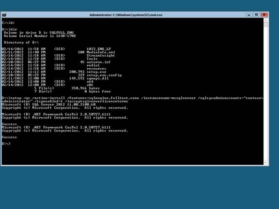 /INSTANCENAME=MSSQLSERVER /SQLSYSADMINACCOUNTS="contoso\administrator"