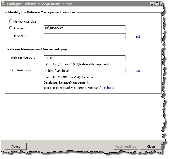 I am using the same database server for RM that I use for TFS (already happen to have an alias configured). Once done click Apply Settings and wait for the configuration to be applied.