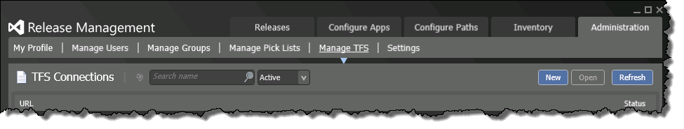 Let’s continue configuring Release Management now that we’ve got a user with the right permissions. Go back to the Release Management Client | Administration | Manage TFS screen and click New
