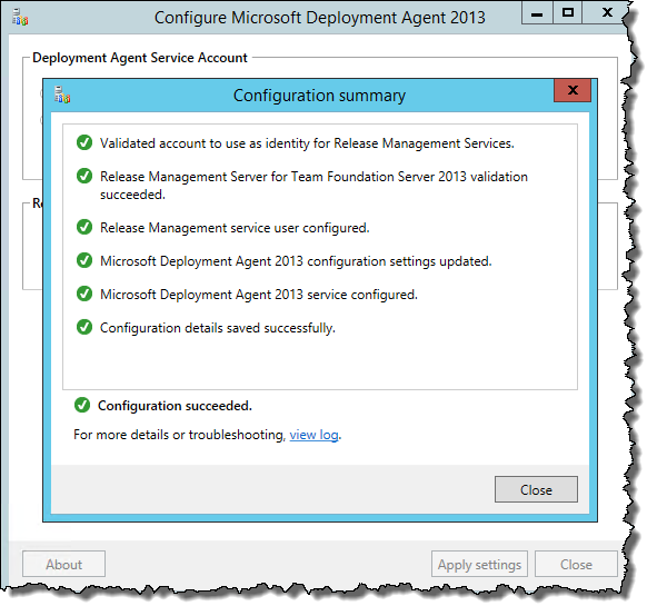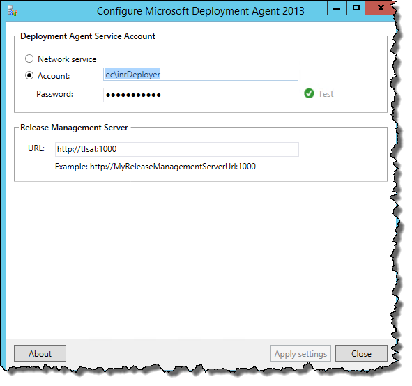 Enter in the Deployment Agent Service Account information (click Test to verify the username and password) and the URL to the Release Management Server and click Apply Settings.
