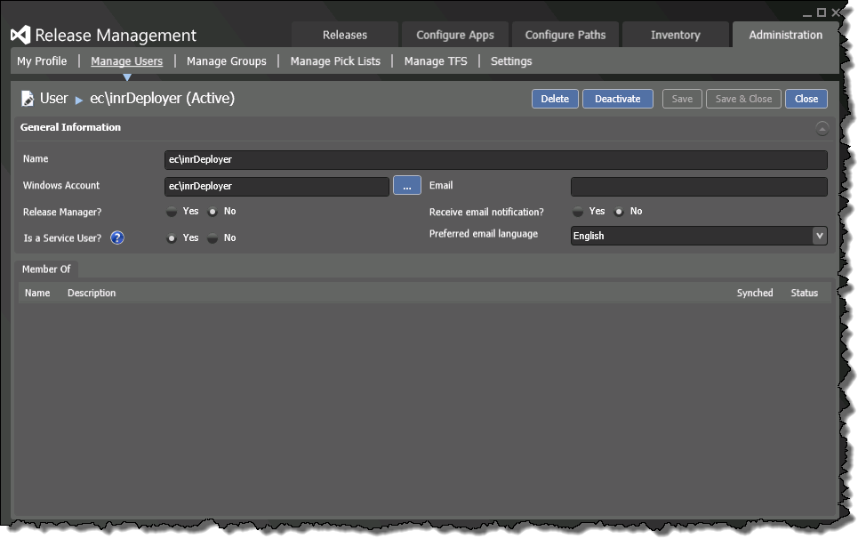 Click Close and Click Close again. We shall now configure the contoso\inrDeployer as a Service User in the Release Management Client, navigate to Administration | Manage Users | New