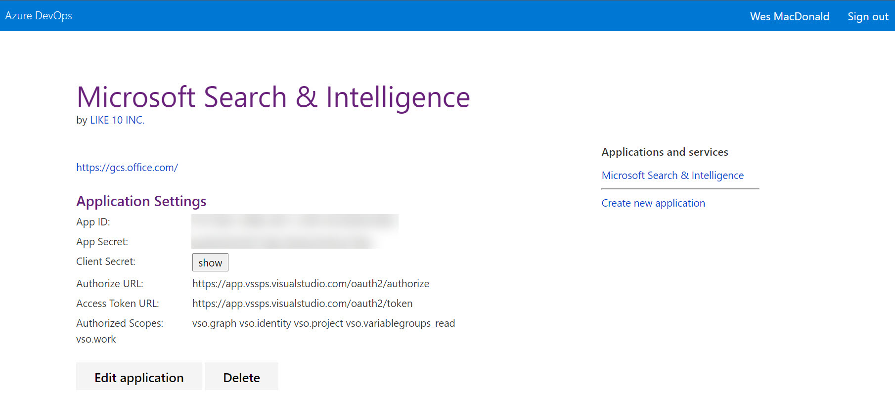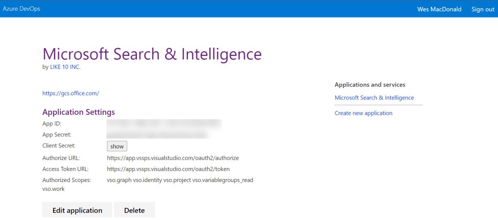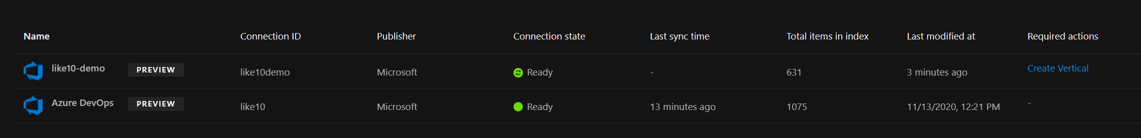 You should see the connector appear shortly like in my screenshot below, the screenshots above are for the like10-demo entry you see below. You will also note that a required action Create Vertical link is present in the last column, you will need to click this to create a named vertical in Bing for your Azure DevOps search results.