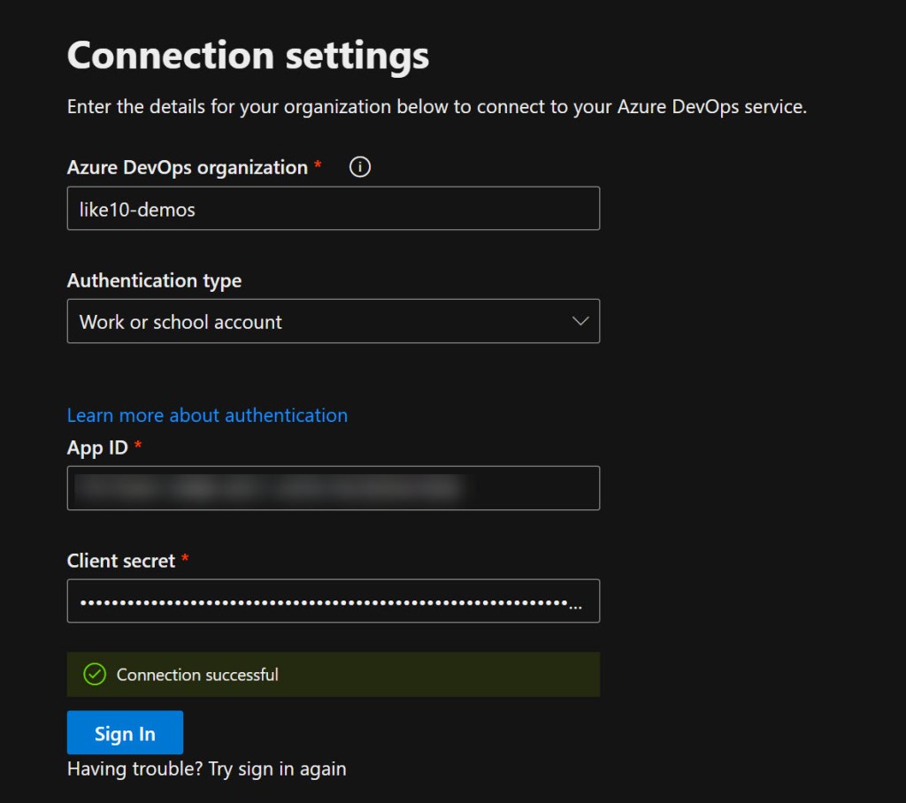 Paste in your App ID & Client secret and click Sign In, if everything is configured correctly you will receive a Connection successful message below the Client secret.