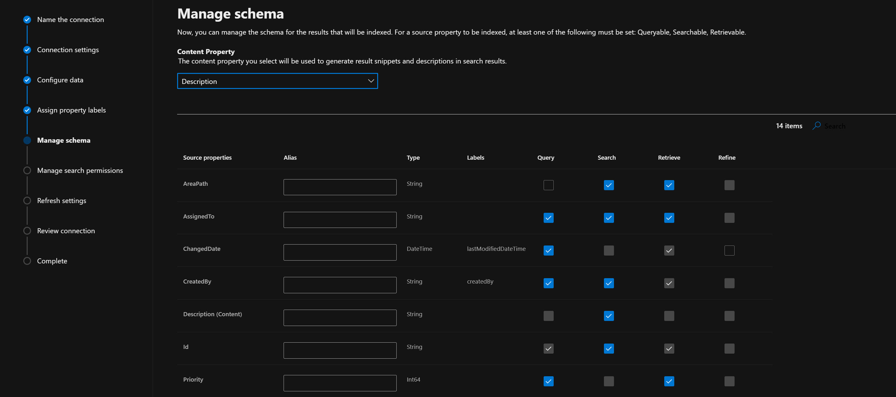 The next step is Manage schema, each source property must have at least one of the following checkboxes selected: Query, Search, Retrieve. The Content Property defaults to Description which makes sense, however you can change this if desired. It is used to generate result snippets and descriptions in the search results that are returned.
